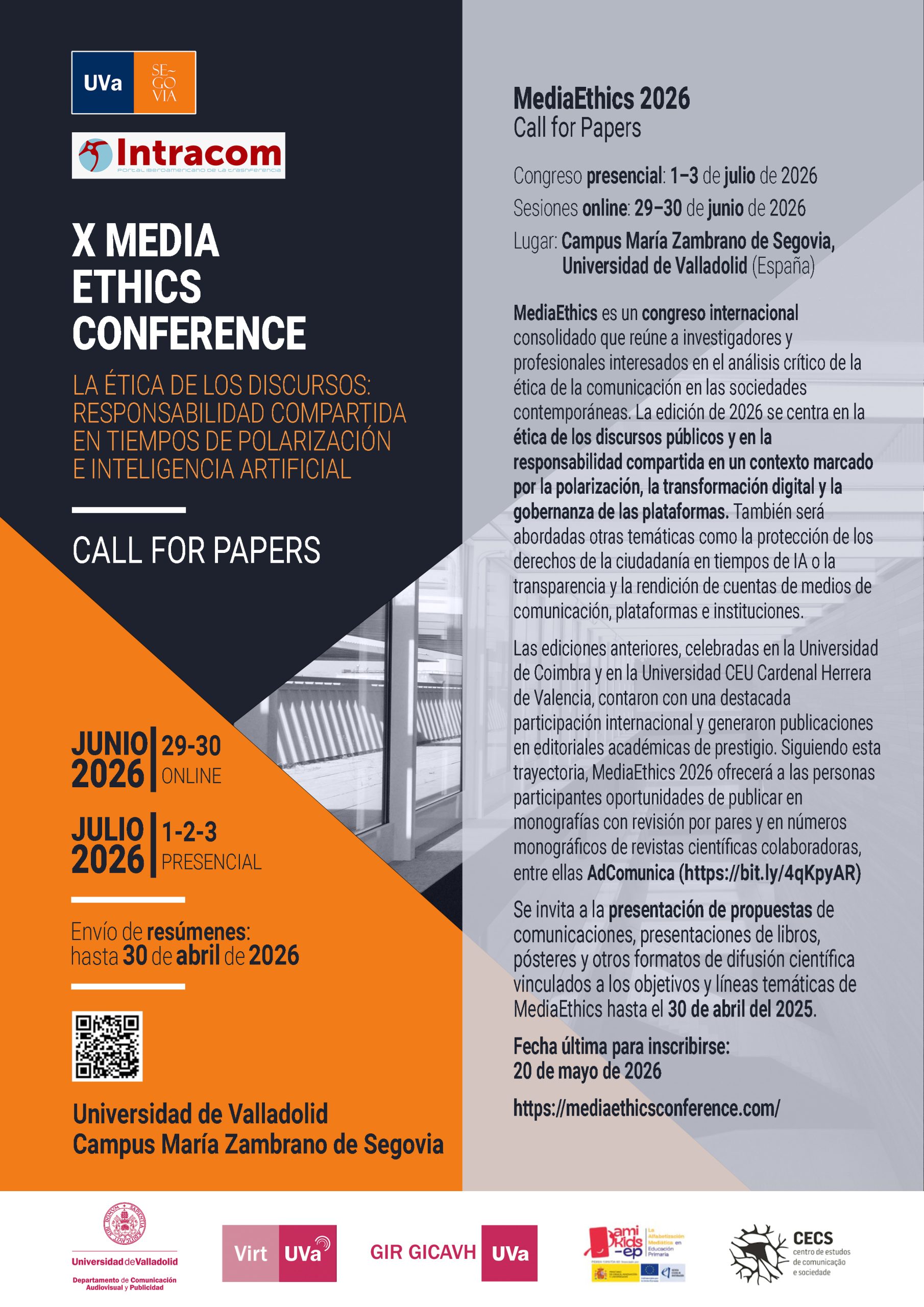 MediaEthics es un congreso internacional consolidad que reúne a investigadores y profesionales interesados en el análisis crítico de la ética de la comunicación en las sociedades contemporáneas. La edición 2026 se centra en la ética de los dircursos públicos y en la responsabilidad compartida en un contexto marcado por la polarización, la transformación digital y la gobernanza de las plataformas. También serán abordadas otras temáticas como la protección de derechos de la ciudadanía en tiempos de IA o la transparencia y la rendición de cuentas de medios de comunicación, plataformas e instituciones.
